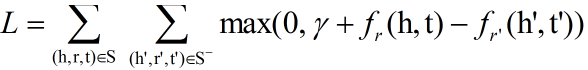 这个打分函数也可以被称为距离函数,用于衡量头实体表示加关系表示与尾实体表示之间的距离,当一个三元组(h, r, t)成立时,这个打分函数应取值为零。基于该打分函数,TransE 模型在训练过程中,采用最大间隔方法的 hinge loss。TransE 的 Loss function 为: