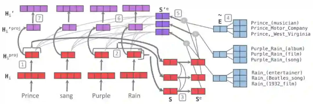 首先识别输入文本中的实体跨度(Entity spans),并使用实体链接器(Entity Linker)从知识图谱中获取对应的候选实体,并进一步获取实体的嵌入表示(不同数据源的实体嵌入表示计算方式不同,下文进一步介绍),以形成知识增强的实体跨度表示。