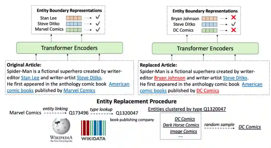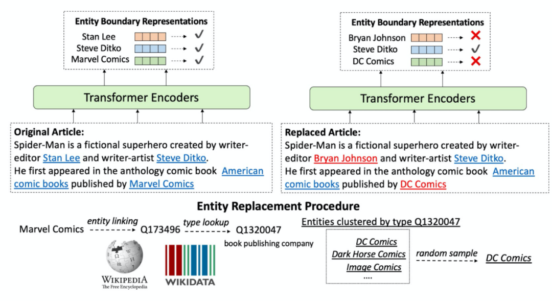 同样是将知识引入预训练模型,但与之前的方法不同的是,论文设计了如下新的 Pre-training task:通过用相同类型的其他实体替换原始文本中的实体,然后训练模型区分正确的实体和随机选择的其他实体。相比先前的以前利用外部知识库获取实体知识的方法,该方法能够直接从非结构化文本中获取真实世界的知识。此方法设计的 Pre-training task 简单有效,数据容易获取,在下游任务效果提升明显。