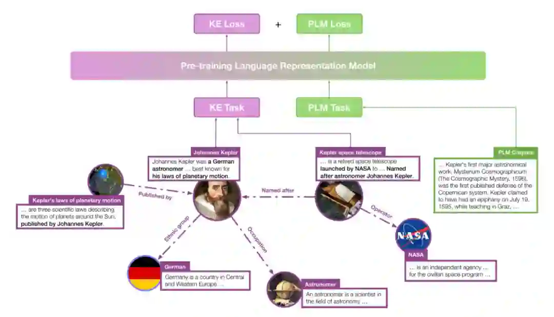 本类方法是指设计一些与知识相关的 Pre-training task,如知识图谱表示学习任务或者针对知识设计的特定任务如实体替换等,如下介绍几篇经典工作。