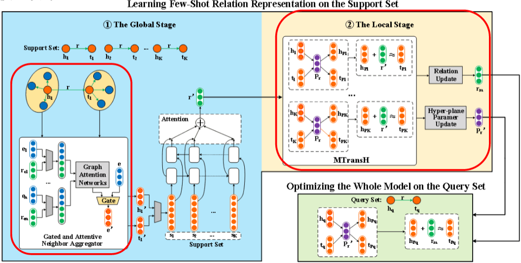 针对上述挑战,我们设计了一种新的 Global-Local 两阶段小样本关系学习模型来实现小样本知识图谱表示学习,我们的方法主要包含两个创新点: