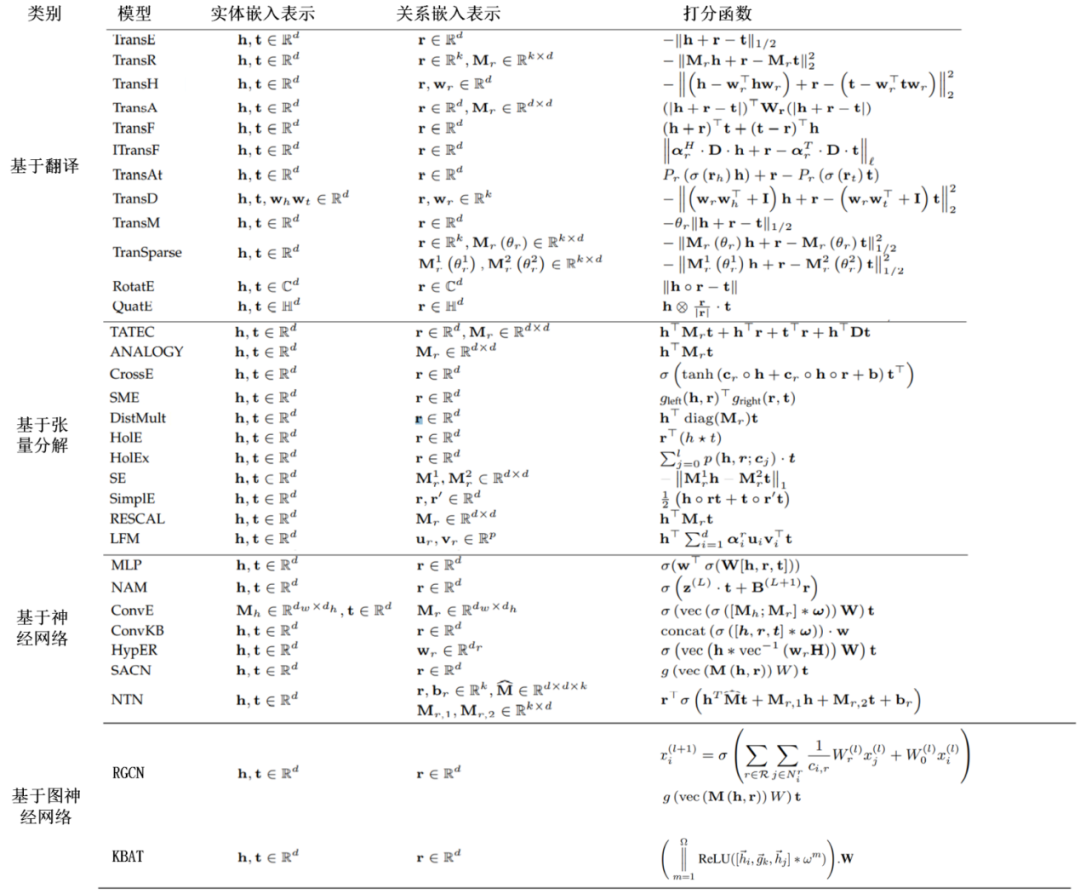 知识图谱表示学习相关综述论文比较多,此处不再赘述,下图对不同类别的典型模型进行了总结。