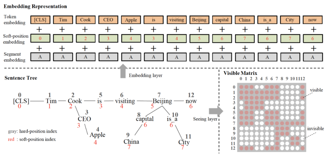 为解决如上两个问题,K-BERT提出了软位置(Soft-position)和可见矩阵(Visible Matrix)两个策略。除了软位置和可见矩阵,K-BERT 中的其余结构均与 Google BERT保持一致,保证了 K-BERT 能够兼容 BERT 类的模型参数来进行 fine-tune,包括直接加载 Google BERT、Baidu ERNIE、Facebook RoBERTa 等公开的已预训练好的预训练模型。