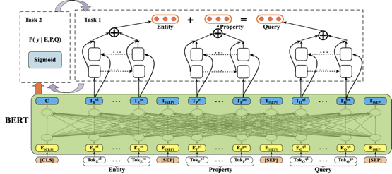 模型采用多任务学习的方法,将 unseen property 识别任务和知识补全任务迭代训练。考虑到实际业务场景中知识图谱主要是由<实体,属性,属性值>组成,并且属性值一般为长文本而非实体。借鉴