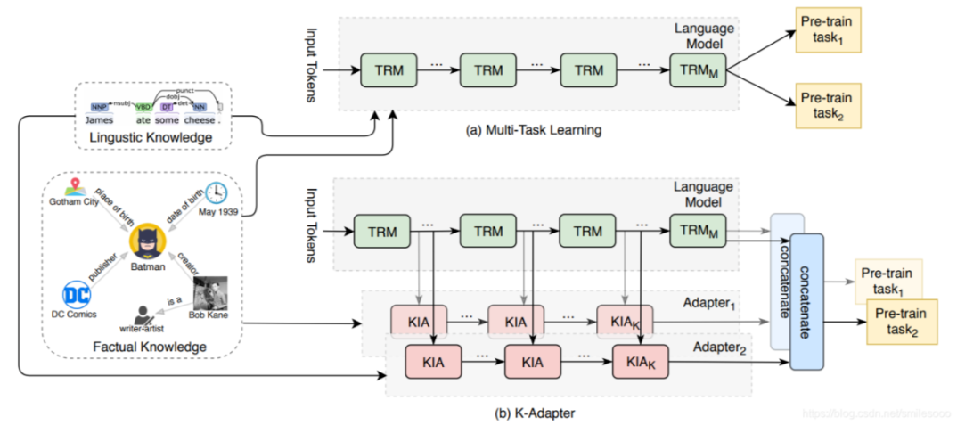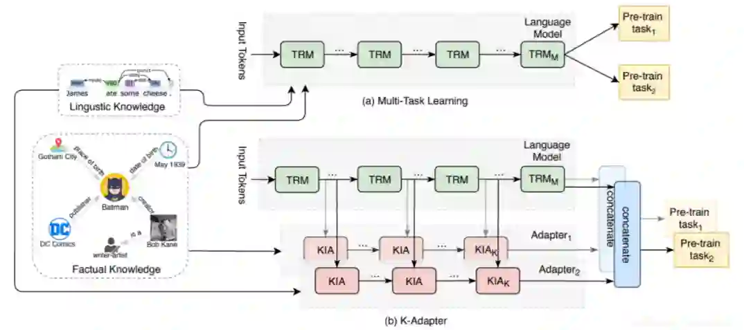 预训语言练模型大多是通过设计如 MLM 和 NSP 等预训练任务利用大量无监督语料进行预训练,学习到文本中语义知识。但上述方法存在明显的缺点,即在每次需要添加新的知识类型时,需要重新预训练整个模型,可能会导致之前知识的遗忘。K-Adapter