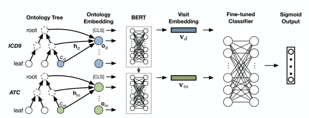 通过将 ICD-9(国际疾病图谱)、ATC(国际药品图谱)融入预训练语言模型中,在大量单次访问的患者电子病例上设计医疗相关的任务进行语言模型的训练,再在多次访问的患者的电子病例上进行 finetune,最终在英文医疗数据集 MIMIC-III 的药物推荐上取得了当前最好的效果。