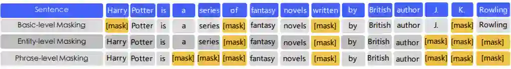 将 mask 的对象从词拓展到短语和知识图谱中的实体,提出了一种多阶段的融合知识的 mask 策略,将短语和实体级的知识融合到语言表达中。这个新的训练任务可以利用文本信息和知识图谱来实现对实体 token 的预测,从而成为一个富有知识的语言表示模型。