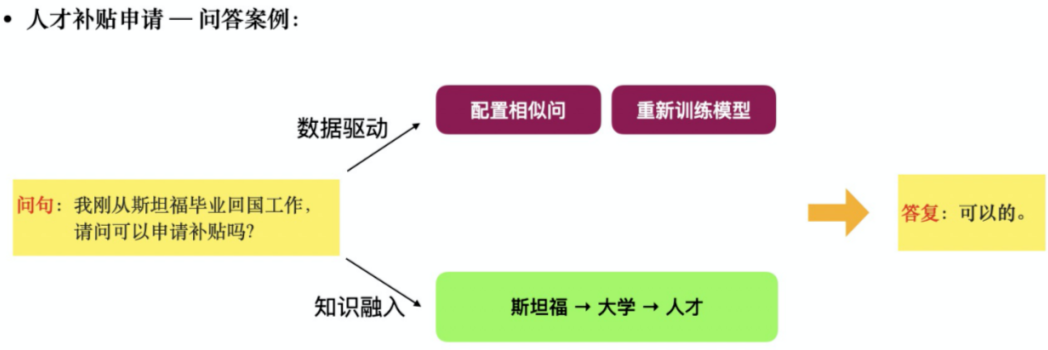 举例来说,对于和“人才工作补贴”相关的问题“我刚从斯坦福毕业回国工作,请问可以申请补贴吗?”,在目前采用传统的语义匹配架构的问答系统中,由于没有关于“斯坦福”的知识,因此往往需要配置若干条相似问数据,重新训练的模型才能给予上述问题正确解答。