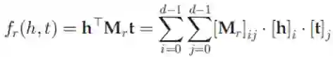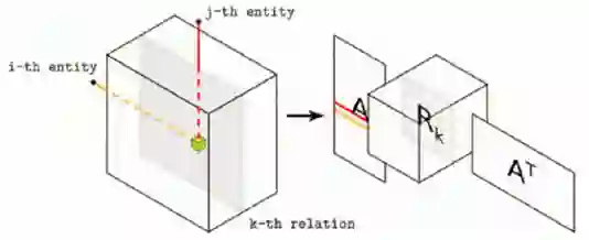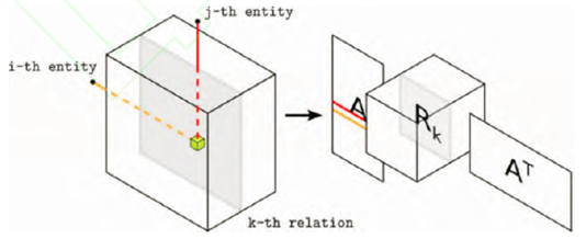 在三阶张量中的每个位置表示第 i 个实体和第 j 个实体之间是否满足第 k 个关系,利用分解后的低维的实体和关系嵌入表示可以还原出三阶张量中的每个位置上的真值。RESCAL 的打分函数为: