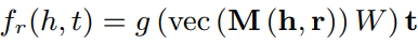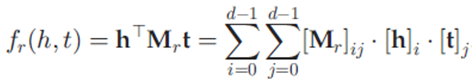 其中,h 和 t 分别为实体关系的嵌入表示,Mr 表示关系的低维张量表示。基于张量分解的知识图谱表示学习模型还包括 DisMult, HolE, ComplEx 等。