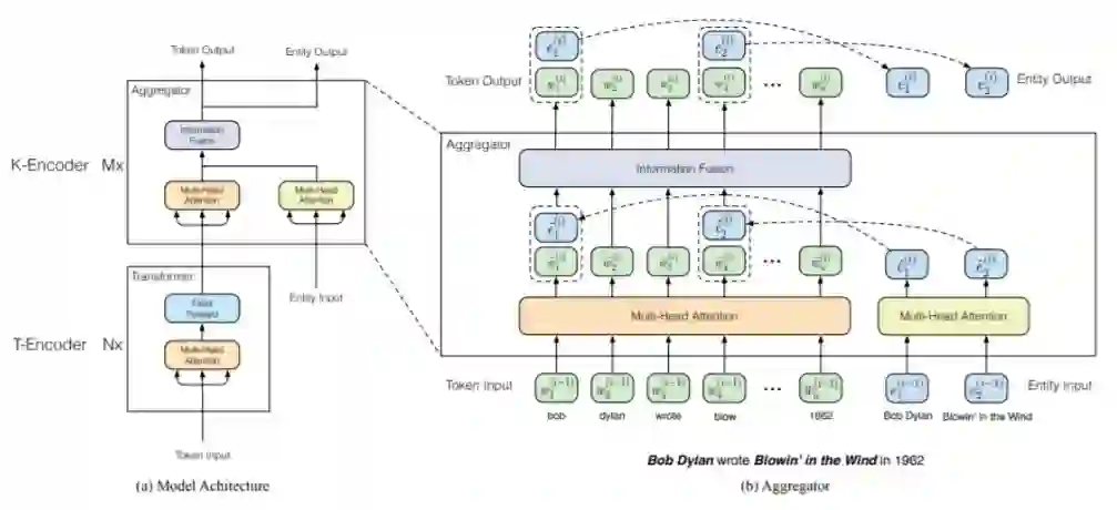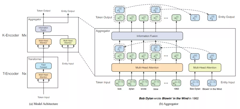 原生 BERT 中的 Transformer 是用来学习上下文之间的词法句法表示,由于本文模型结合了知识表示信息,该方法在 Transformer(T-Encoder)之后增加了一个聚合模块(K-Encoder)来将文本 token 表示和实体表示映射到同一个向量空间。如图,虚线框中的 w 和 e 分别表示经过实体链接处理后链接到一起的文本 token 和实体。