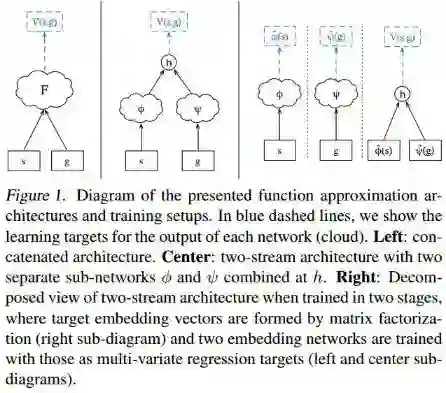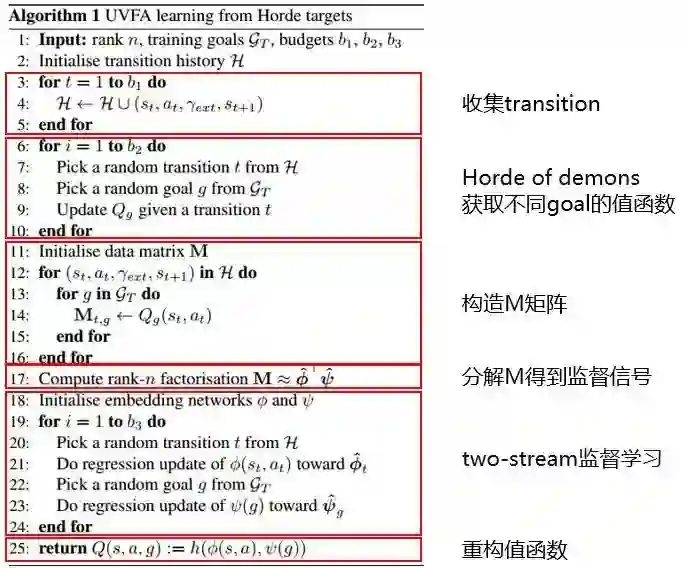 ,这样值函数就变成在某一状态(或状态动作)某一目标下的价值。将给定状态和目标映射成对应的状态目标值的方法是,分别将状态和目标过自己的神经网络,拟合出对应的隐变量,然后将两个隐变量通过某种方式结合成一个标量就产生了对应的值,文中采用的方法是向量内积。在拟合指定状态和目标的隐变量时需要使用监督学习的方法,因此必然需要label,文中使用一种Hord of demons的方式可以产生不同目标对应的状态目标值,然后通过低秩分解的方式将其分解为状态对应的隐变量和目标对应的隐变量,于是label就有了。因此,整个UVFA的算法流程就是,通过某种方法获取各个状态目标对应的价值,然后通过低秩分解将这个值拆解为状态对应的部分和目标对应的部分作为label,再利用监督学习学习状态和目标对应隐变量的函数拟合,这样以后就可以通过任意状态和目标直接拟合出对应的隐变量,最后通过向量内积整合成一个状态目标值,起到泛化作用。