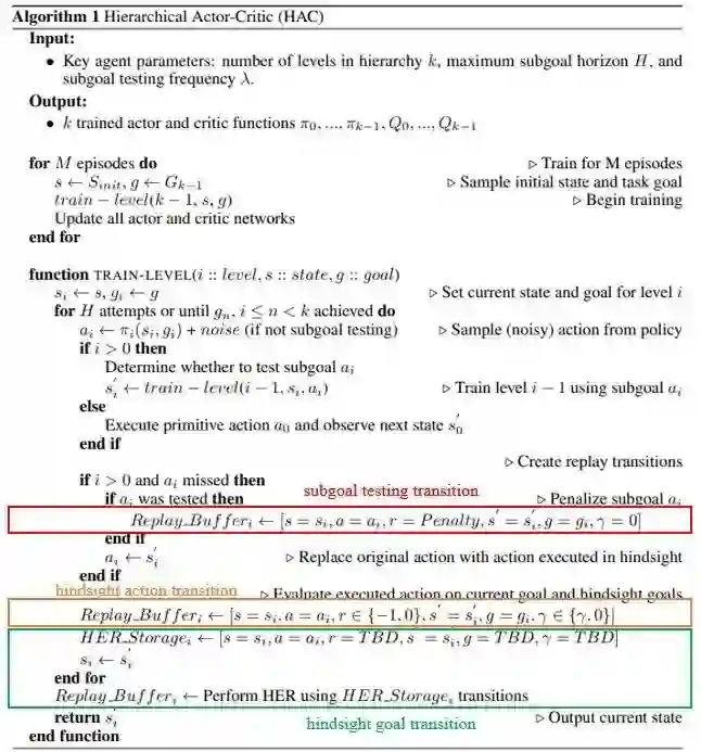 本文提出三种transition:(1)hindsight action transition,对于非最低层来说action就是选goal,或者说是选state,因此action space就是state space,如果上层设定的goal下层没达到,那就将已达到的state作为goal,相当于对上层的action做了hindsight,这样基于下层已经最优的假象进行上层的训练,从而暂时忽略掉下层policy的变化,这部分是对action的调整;(2)hindsight goal transition,这个就是原始的HER所干的事情,是对goal的调整,解决reward稀疏的问题;(3)subgoal testing transition,在上述两种调整下,agent用于更新的transition都是可到达的一些state,对于一些较远的目标,可能无法实现,因此以一定概率进行测试下层policy能否实现当前goal,当goal无法被下层完成时,即给出不切实际的遥远goal时,给以惩罚。