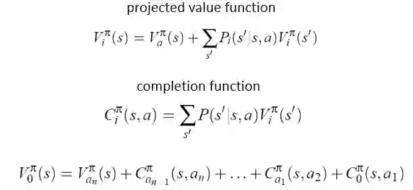 本文的思想是对任务进行值函数分解,分解为多个子任务,每个子任务对应一个MDP。QMIX是对不同agent的Q进行分解,本文是对不同子任务进行Q分解,属于multi-level control。算法公式就是值函数的贝尔曼方程,一层一层向下分解就能写成所有子任务值的迭代和形式,可以把选取某个子任务看成传统的选择与环境互动的动作。优化方法和一般的Q-learning是一样的。