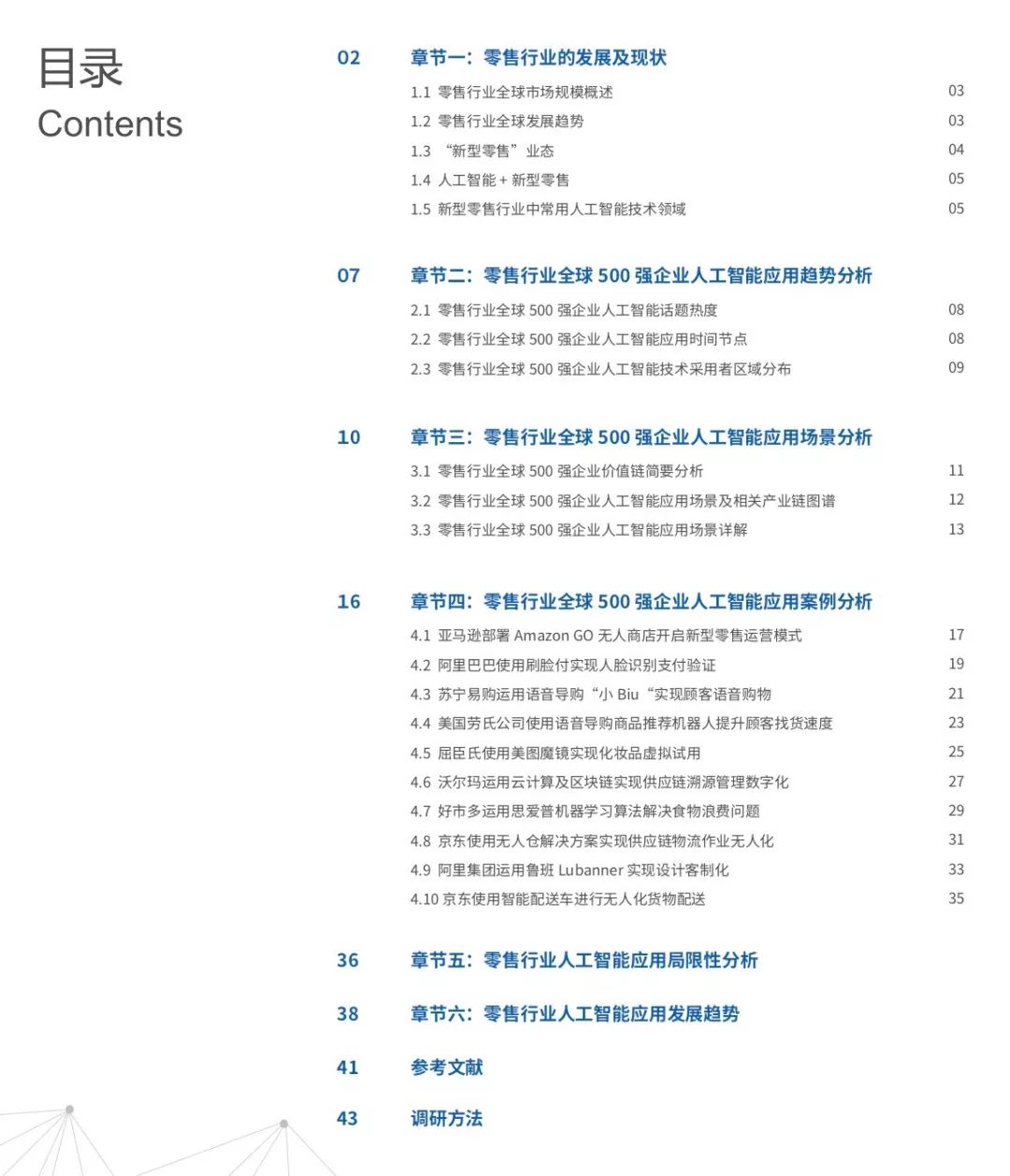 在此背景下,机器之心产业研究团队推出了《当新型零售遇上人工智能——AI+零售行业研究报告》。报告基于「人、货、场」的概念将新型零售行业划分为消费场景、经营运营和供应链三大场景,并归纳 10 大人工智能应用场景,更囊阔多家零售行业全球 500 强企业案例,从技术与落地层面详细剖析各企业人工智能领域应用。报告目录如下: