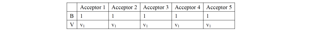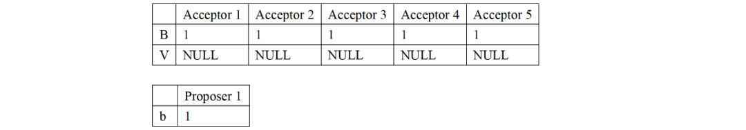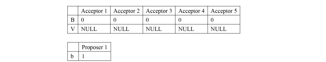 基本例子里有5 个Acceptor,1 个Proposer,不存在任何网络、宕机异常。我们着重考察各个Accpetor 上变量B 和变量V 的变化,及Proposer 上变量b 的变化。
