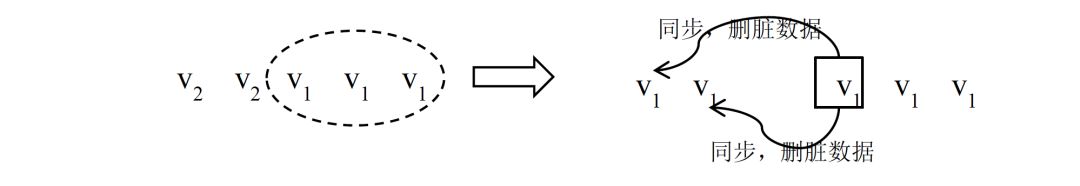 例:在N=5,W=3,R=3 的系统中,某时刻副本最大版本号为(v2 v2 v1 v1 v1),此时v1 是系统的最新的成功提交的数据,v2 是一个处于中间状态的未成功提交的数据。假设此刻原primary 副本异常,中心节点进行primary 切换工作。这类“中间态”数据究竟作为“脏数据”被删除,还是作为新的数据被同步后成为生效的数据,完全取决于这个数据能否参与新primary 的选举。下面分别分析这两种情况。