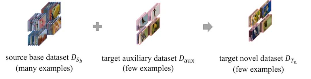 在我们的setting下,我们将未曾被利用起来的target base 做为来自target domain的额外数据,来引导模型的学习。具体而言,对于每个 中的类别,我们随机采样 个样本 (最终方法中, ),这些样本共同构成我们的auxiliary data 。