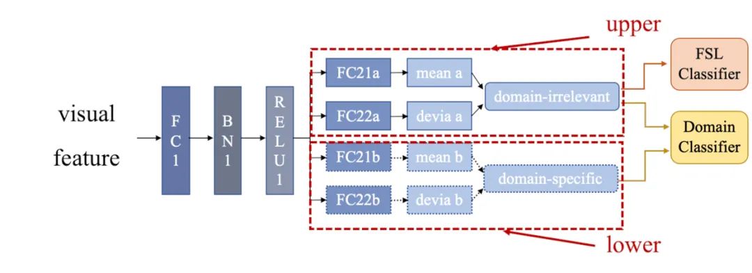整个模块的设计参考了VAE的encoder结构,但是我们这里没有用decoder,并且我们会encode出两个latant vector,一个是domain-irrelevant features,另一个是domain specific features。