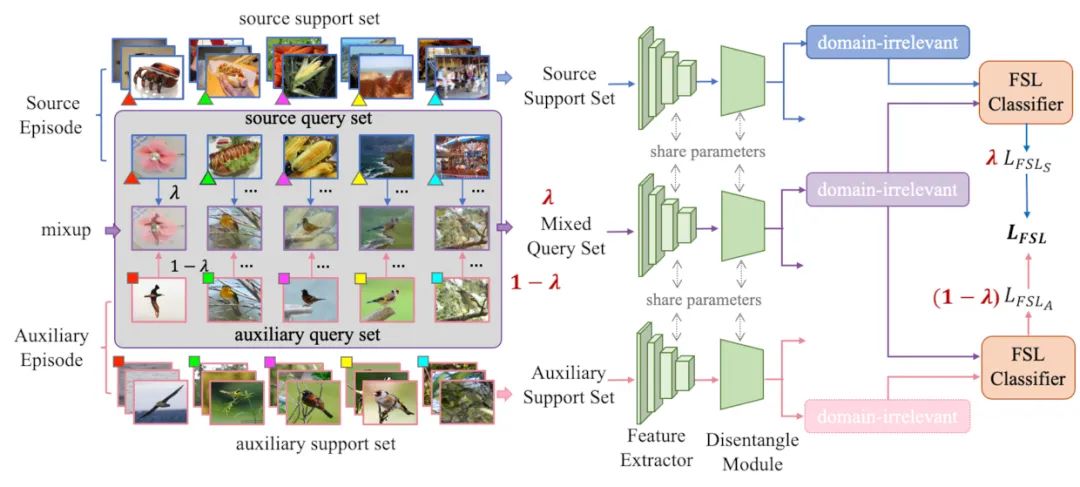 2) 用mixup模块对以 的比例对这两个episode的query set进行混合,保持各自的support sets不变,得到source support set, auxiliary support set,以及mixed query set;