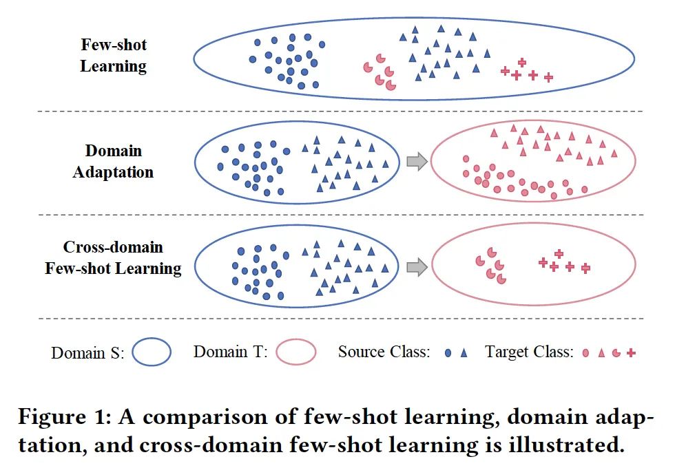 FSL: 经典的小样本学习从源域迁移知识到目标域:1)源域和目标域处于同一个domain(分布基本一致);2)源域和目标域的类别集合的交集为空;3)目标域每个类别的可用样本量极少;