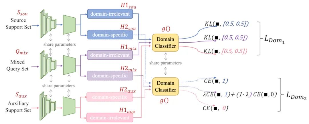 3) 对source support set, auxiliary support set,以及mixed query set这三路都各自依次送入feature extractor以及disentangle module中,获取各自的domain-irrelevant features, domain-specific features;