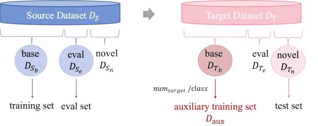 在FWT提出的benchmark中,我们从source datatset迁移知识到target dataset中,而每个dataset都被分成类别不相交的base/eval/novel(具体的原因是因为例如这里的source是mini-Imagenet,mini-Imagenet本身作为FSL的数据集,自然需要disjoint的base/eval以及novel sets,而正如上文所述,现实中我们可以自行进行划分,或者手工标注来实现这样的setting),标准的CD-FSL就是将source base 用于模型训练, source eval 用于模型验证,最终在target novel 上进行模型测试,当然还可以测试模型在source eval 上的性能。