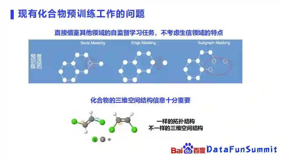 我们先总结一下我们刚刚介绍的三种化合物预训练工作的一些问题,我们可以发现其实他们都是直接借鉴了比较成熟的自然语言处理、图像处理领域的自监督学习任务的方法,但是没有太考虑生物领域的特点。像node masking、edge masking或者subgraph masking的方法,其实都是盖住了化合物里面的某个节点,或者一条边,或某个子图,然后估算出他们是什么。