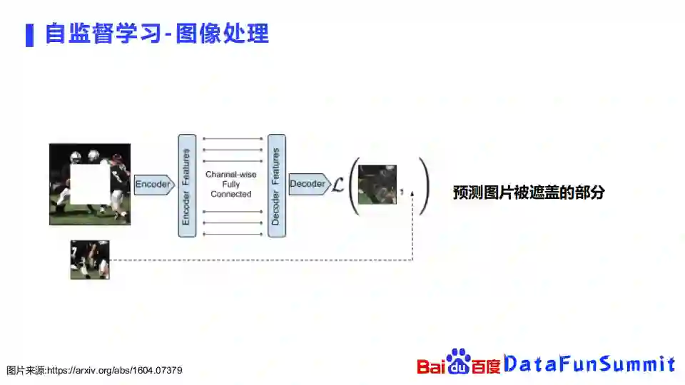 在图像处理领域,方法也是类似的。有一张图片,最简单的方式就是随机从图片里面挖空中间的一块,将这张图片给encode,再decode出来它中间被挖空的那一块内容是什么。通过这样的方式,可以构造自监督学习的任务去预测图片被遮盖的部分。