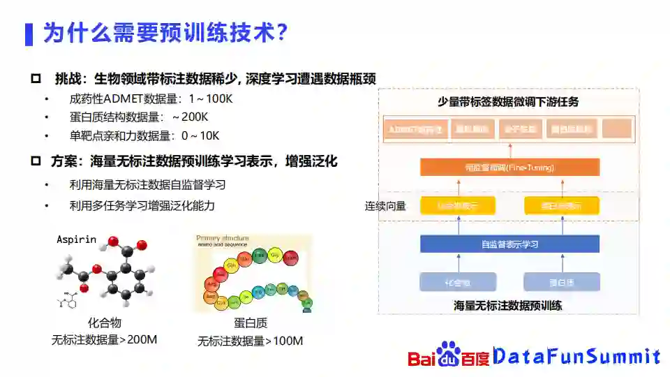 上图中的右边这个图显示的是我们使用预训练的一个方式,首先使用海量的无标注数据去进行预训练,学习化合物和蛋白质的表示,然后在含有少量带标签数据的下游任务上进行微调,去学习ADMET,虚拟筛选等等任务。