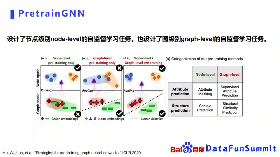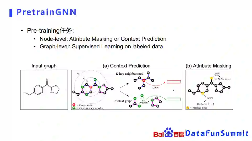 我们先回顾一下最经典的PretrianGNN是怎么做的。它是斯坦福的同学提出的一个方法,他最先提出将这个图预训练用在化合物上面,设计了节点级别node-level的自监督学习任务,也同时设计了图级别的graph-level的自监督学习任务。