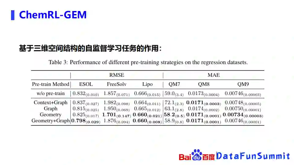 A:现在是用RDKit去获取的,可能也有同学会问,RDKit获取到的空间信息其实是比较不准的,确实它也是跟真实的空间结构有一点差距,但我们也发现,即使是用这种不准的空间结构,在预训练上面或是在网络结构上面也有了不错的效果。此外,我们在paper里面重新做了一个实验,使用了准确的3D结构,模型效果更为明显。