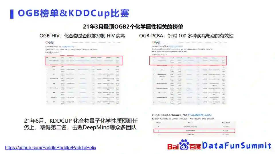 此外,我们也在今年的三月份去参加了一个OGB的两个化合物属性相关的榜单的打榜,其中一个是化合物是否能够抑制HIV病毒,以及针对100多种疾病靶点的活性预测。当时是在榜单的第一名。在今年的六月份我们参加了KDDC的化合物的量子化学性质的任务,也取得了第二名,击败了DeepMind等众多团队。
