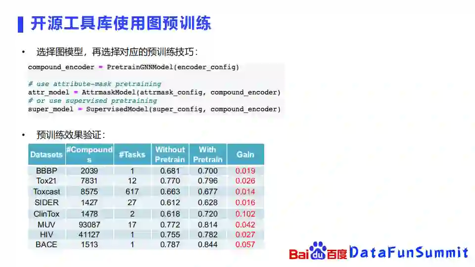 有了这些网络以后,我们可以再选择对应的预训练技巧,比如刚刚提到的pretrainGNN上面的一些预训练技巧,我们可以选用不同的自监督学习任务去进行学习。我们的验证也发现,使用预训练的方式确实在许多的下游任务上取得了不错的表现。