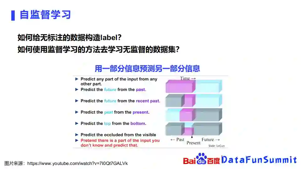 自监督学习任务,要解决的问题是如何去给一个无标注的数据构造label,或者说如何使用监督学习的方法去学习无监督的数据集。最常用的方法,就是用一部分信息去估算另外一部分信息。比如通过过去的信息去预估未来的信息,又或是根据当前的信息去估过去的信息,或者从下面的信息预估上面的信息等等。