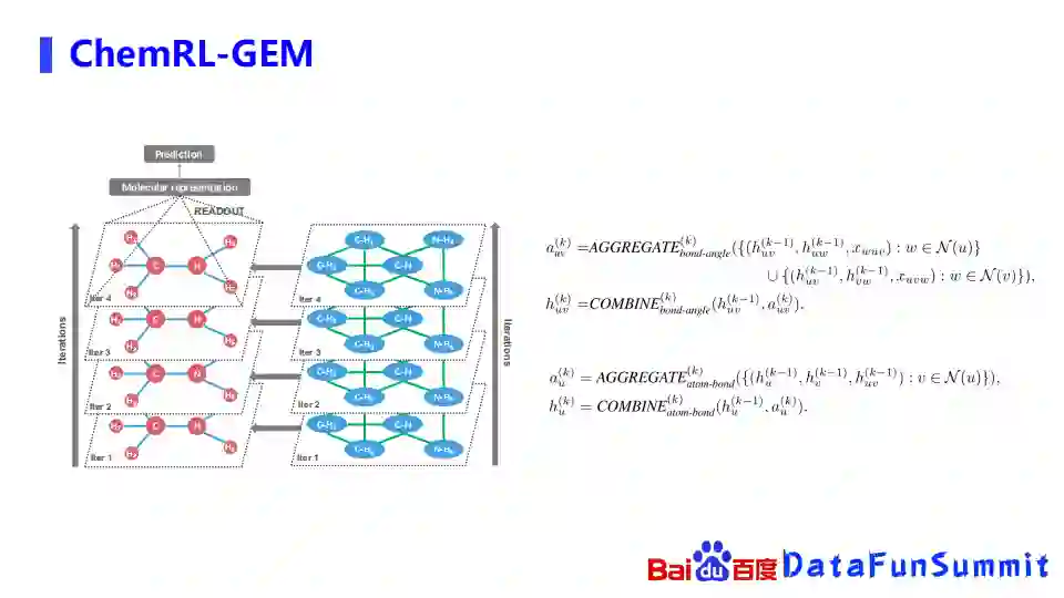 在图网络上,我们先把右边这个化学键和键角组成的图网络进行消息的传播,信息赋给左边的以原子和化学键组成的图网络,每一层传递上去之后,再去左边的原子和化学键组成的图网络抽取信息,再进行下游任务或预训练任务的一些prediction。