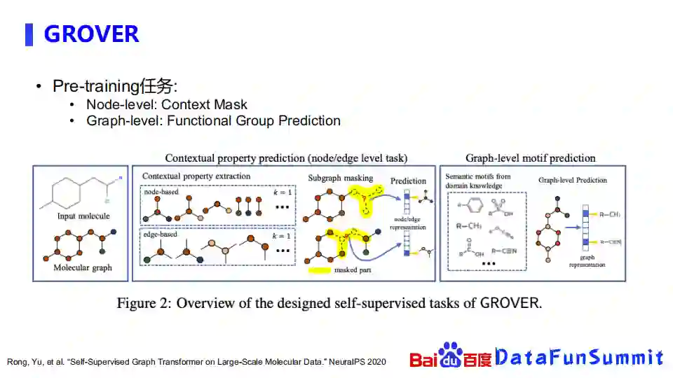 GROVER是腾讯之前的工作。他们是在PretrainGNN的基础上做了一些改进,在自监督学习任务上,从边或者是点的masking扩展到subgraph的masking。对于node-based, 首先随便抽取一个中间的节点,并且获取1-hop,例如邻居结点,然后把整个子图盖住,再去预估被盖住的这个子图是什么。edge-based也是类似的, 随机抽取了一条边,然后要把它周围的子图抽取出来,再去估算被盖住的子图是什么。在graph-level上,他们提供了一种比较新颖的方式,通过对graph进行表示之后,预测graph里面包含了哪些子结构,比如包含哪些功能团。