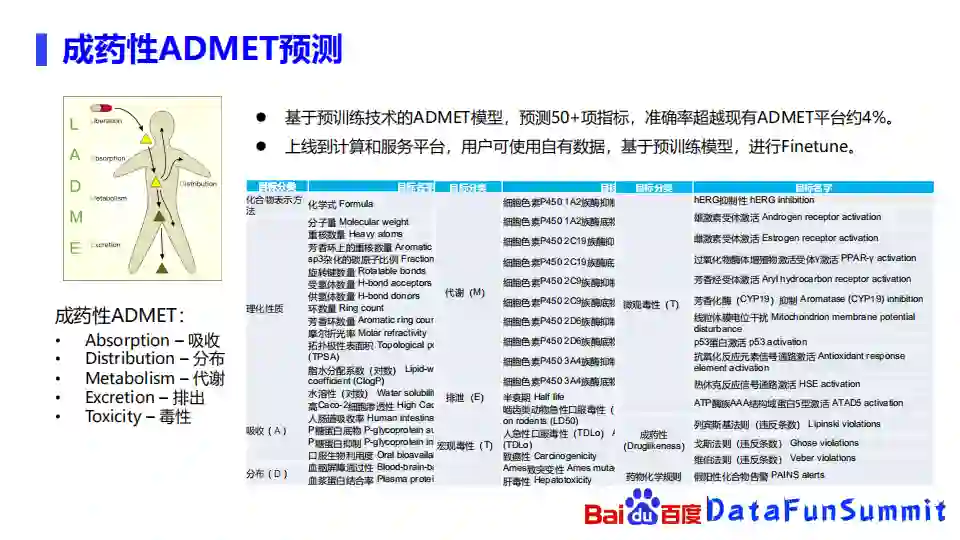 最重要的就是它是不是具有毒性,如果有毒性,即使它具有生物活性也是不能成药的。我们是基于预训练技术去训练了一个ADMET模型,预估了多达50多项的指标,我们的评测准确率超越现有ADMET系统大概4%左右,我们的服务已经上线到了一个计算服务平台,用户除了可以直接去使用以外,也可以使用一些自由的数据去基于预训练模型进行一些finetune,得到一些定制化的模型。