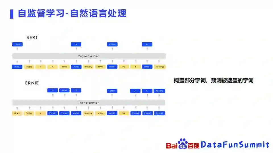 自监督学习在自然语言处理里面用的最多就是masking的方式。自然语言处理里面的输入就是一个句子或者一个字词的序列。最经典的BERT就会将句子序列里面的一些字给遮盖掉,然后估出来被遮盖掉的字词是什么。ERNIE就是百度之前发布的,BERT的进一步延伸,它除了会mask掉一个字,也会mask一个词组,估算出这个词组是什么。