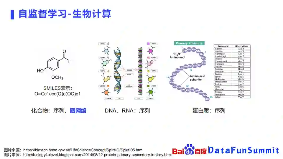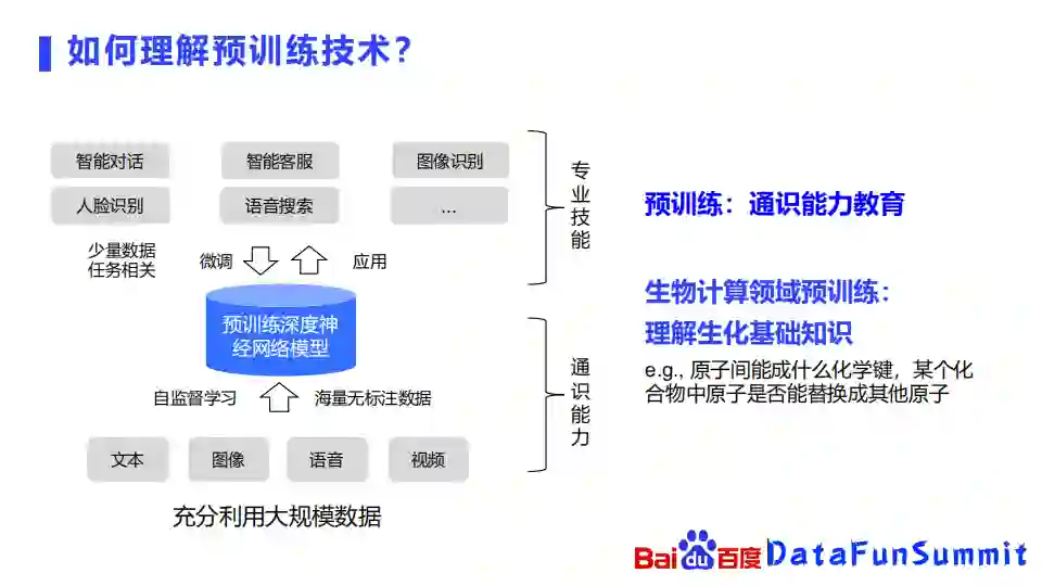 在除了生物的其他领域,预训练技术已经比较成熟,它会以文本,图像,语音,视频等作为输入,通过对这些海量的无标注数据去构造自监督的学习任务,去学习这些事物的表示,然后再在更为专业的一些任务上面去进行微调,比如智能对话、人脸识别等更专业的领域去进行学习。换句话说,可以将预训练学习看作通识能力的学习,比如一个小朋友在小学中学的时候,他会去先学语文、数学、英语等比较基础的课程,到了大学才会去学一些比较深的专业知识。在生物领域也是类似的,我们可以将生物计算领域的预训练认为是在理解生化的基础知识,比如两个原子之间,能形成什么样的化学键,或者某个化合物中一个原子是否能替换成其他原子等等。
