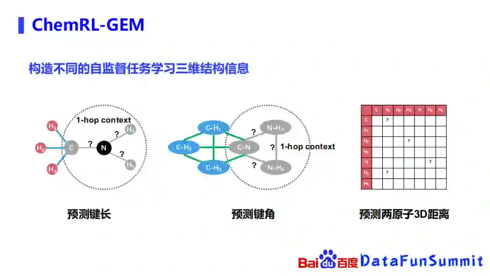 除了网络结构,最重要的是希望通过构造一些自监督学习任务,从海量无标注的数据里面学习到一些基础的化学知识。我们构造了不同的自监督任务去学习三维信息,比如左边的第一个任务,首先我们会随机的选取其中的一些原子,把它以及它的1-hop盖住,预估以这些原子为中心的键长是多少。第二个任务也是类似的,我们也是以某个原子为中心,把它相连的一些化学键和键角都盖住,预测这些键角是什么。左边这两个预测键长键角的任务,都是当成一个回归任务去进行预测。