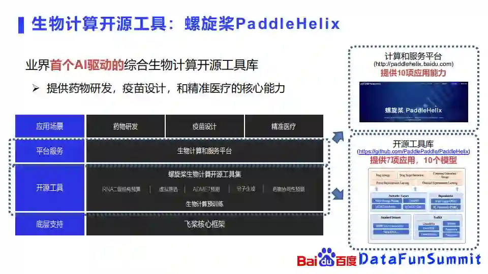 最后,来介绍一下螺旋桨图预训练技术的一些应用。PaddleHelix是一个以AI驱动的综合的生物计算的开源工具库,提供药物研发,疫苗设计和精准医疗的核心能力,主要包含了开源工具和平台服务两大块内容。开源工具已经在去年年底在github上线,目前启动了大概七项应用和十个模型,平台服务目前也提供了十项应用的网站,欢迎大家去体验。