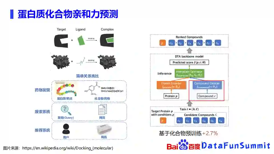 如果我们把药物发现,和搜索、推荐系统去类比,就可以发现,其实药物发现里面的靶点蛋白质就和搜索系统里面的查询或推荐系统里面的用户是相似的,药物发现里面的化合物药物和搜索系统里面的网页或者推荐系统里面的商品也是类似的。简单来说就是能不能根据蛋白质靶点的信息,从海量化合物里面筛选出来合适的一些化合物作为潜在的药物。因为蛋白质化合物亲和力的预测涉及到蛋白质,那么化合物的表示部分,我们同样也可以用化合物的预训练去进行表示的增强。我们的实验也发现其化合物的预训练能提升大概2.7%的效果。