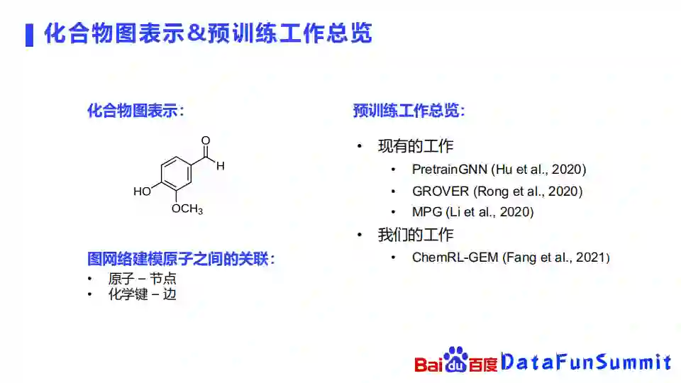 接下来重点介绍图预训练技术学习化合物的表示。