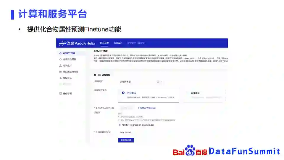 在计算和复合平台上面,我们提供化合物属性预测的Finetune功能,可以在网站上面选择要训练新的模型,再选择使用回归算法还是分类算法,上传相应的一些数据,就可以用计算平台上的算力去进行训练,从而得到自己的一些属性预测的模型。