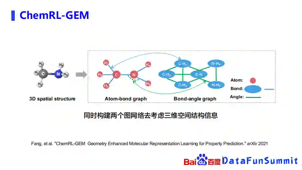 一个化合物,很天然的就可以被表示成一个图。我们可以把一个化合物里面的一些原子就当成是图网络里面的节点,连接这些原子之间的化学键就看成是图网络里面的一些边。通过这样的方式,我们就可以把一个化合物构成了一个图,不同的化合物就能构成非常多的不同的图。现有的预训练工作主要包括PretrainGNN(斯坦福),GROVER(腾讯),MPG(清华&平安)。我们最近也发布了一个叫ChemRL-GEM的模型,利用三维的空间结构去做预训练的表示。