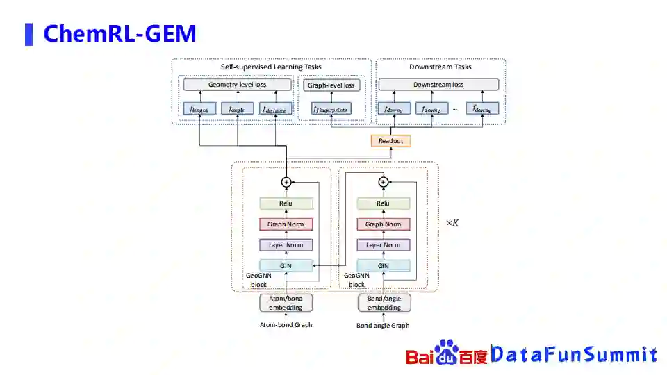 上图是ChemRL-GEM的总示意图,可以从下面开始看起。我们首先构造了原子和边的一个网络,还有边和键角的一个网络,左边是图网络的结构,右边是边和角度的图网络结构,右边的图网络的信息,在每一次聚合完以后就会传导到左边的图网络,然后左边的图网络在经过多层聚合好所有的信息以后,就会使用基于三维空间结构的自监督学习任务去进行学习,右边在Readout之后会进行下游任务的学习。