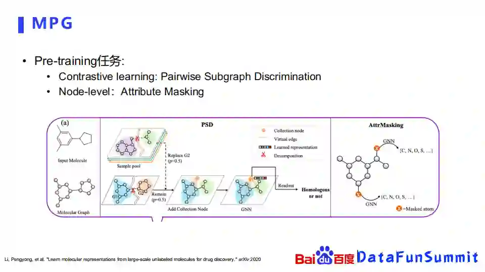 最后介绍一下清华和平安的工作,他们是通过一个对比学习的方式去学习化合物的表示。比如他们会随机的把一个化合物切成两块,像这里绿色的一块和紫色的一块,另外的化合物也是类似地剪成蓝色的一块橙色的一块,然后把有一定概率会来源于两个化合物的内容给拼接起来,再去判断,重新拼接出来化合物是不是由两个不同的化合物拼起来的,还是两个模块都是来源于同一化合物的,通过这样对比学习的方式去构造自监督学习任务。他们使用的另外一个自监督学习任务,也是之前介绍过的Attribute Masking,就是随机掉某一些属性,然后再去预估。