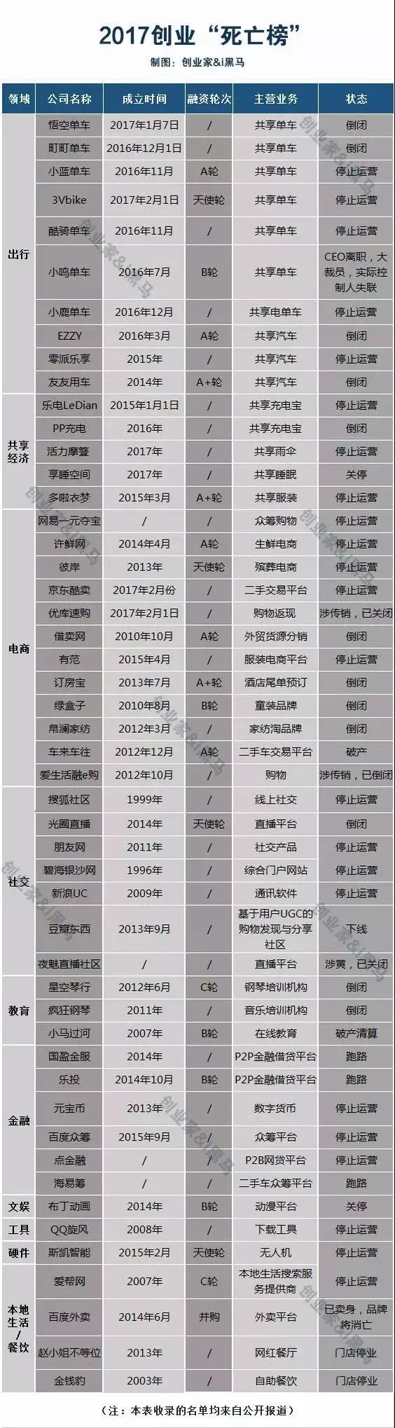 2017年即将结束,创业家&i黑马盘点了这一年中未能活下来的创业项目,历来称作“创业死亡榜”。其中,你能看到的项目的创始人,在启动之时大多饱含热忱,死亡来临前一刻也曾奋力争取生机。