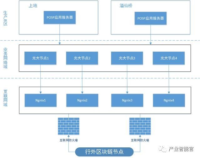 在区块链系统中,我行有4个VP节点实现全联通,并且每个节点都连接一个Nginx,作为其双向代理,具备防火墙,并与外部节点相连。并且,在上地和酒仙桥分别部署一个POSP应用服务器。